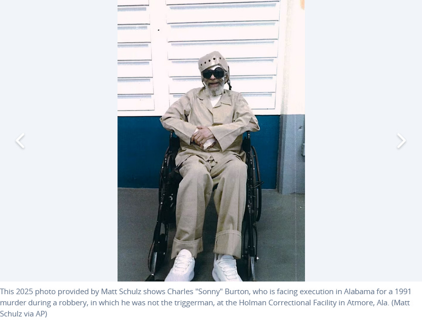 Above is Charles “Sonny” Burton, a black man who lives in Alabama—on Death Row, pictured at age 41. In 1991, he led a robbery gang into an Autozone in a robbery which killed Doug Battle, a 31 year-old veteran of the US Army. As the leader of the gang, he was sentenced to death under the centuries-old felony murder rule, even though it was one of his henchmen who pulled the trigger.