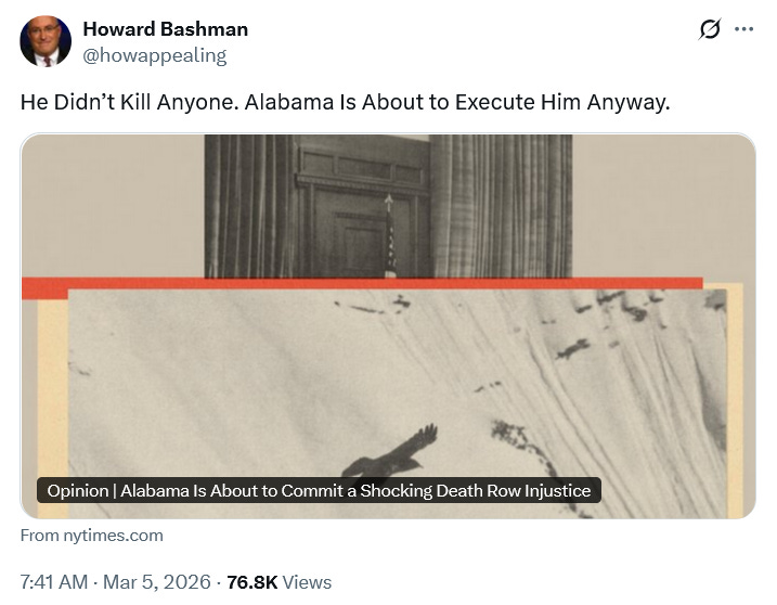 There’s an op-ed in the Alabama Political Reporter by the victim’s daughter, Tori Battle, opposing the execution:
