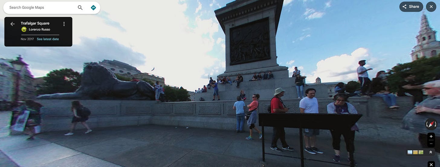 There may be a photograph of me somewhere, age 9, wearing these pigeons, but I can’t find it. Those, from the Museum of London of anonymous young Britons, gives the general idea. Recently, I did a Google map search for Nelson’s Column, which brings up the picture you see below….and all the pigeons are gone.