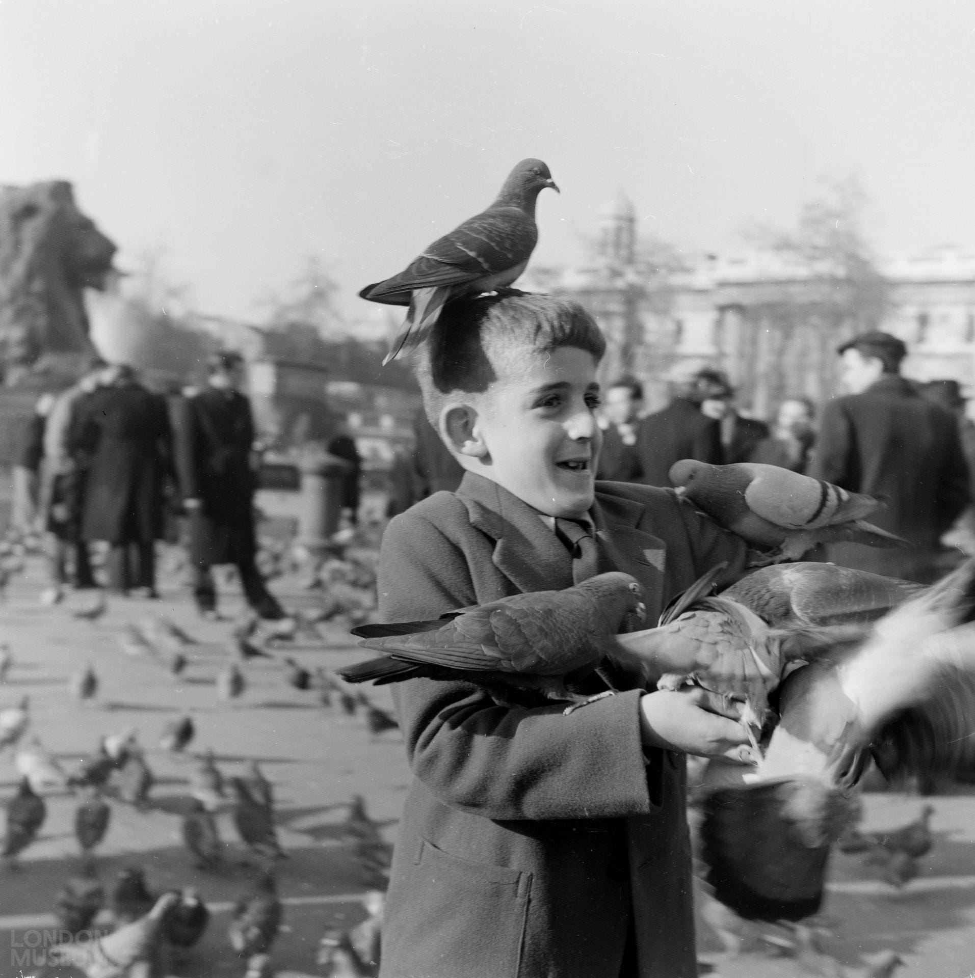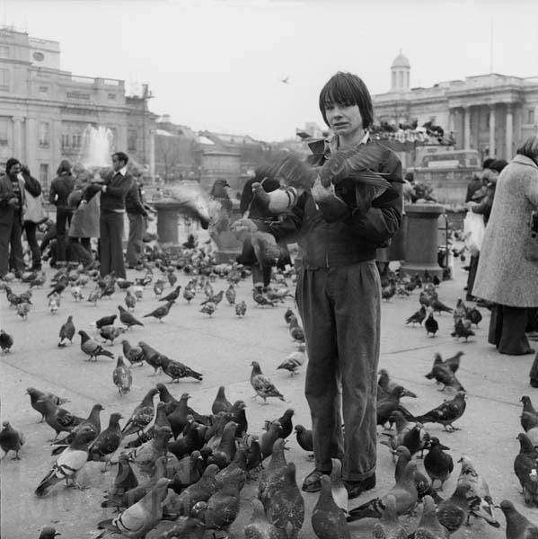 As an only slightly older person, I actually visited London and fed them myself. I bought a cup of birdseed, and pigeons came and roosted on me and ate out of my hand. Like this: